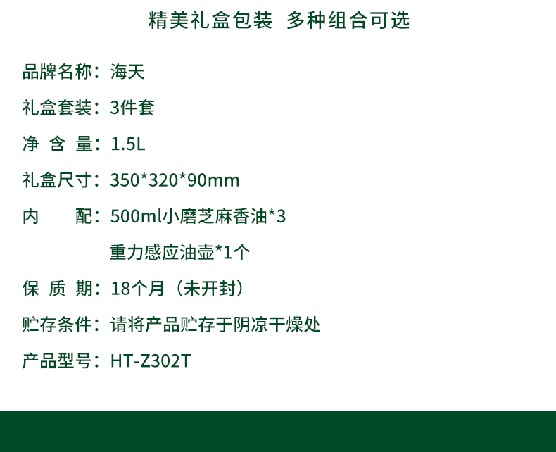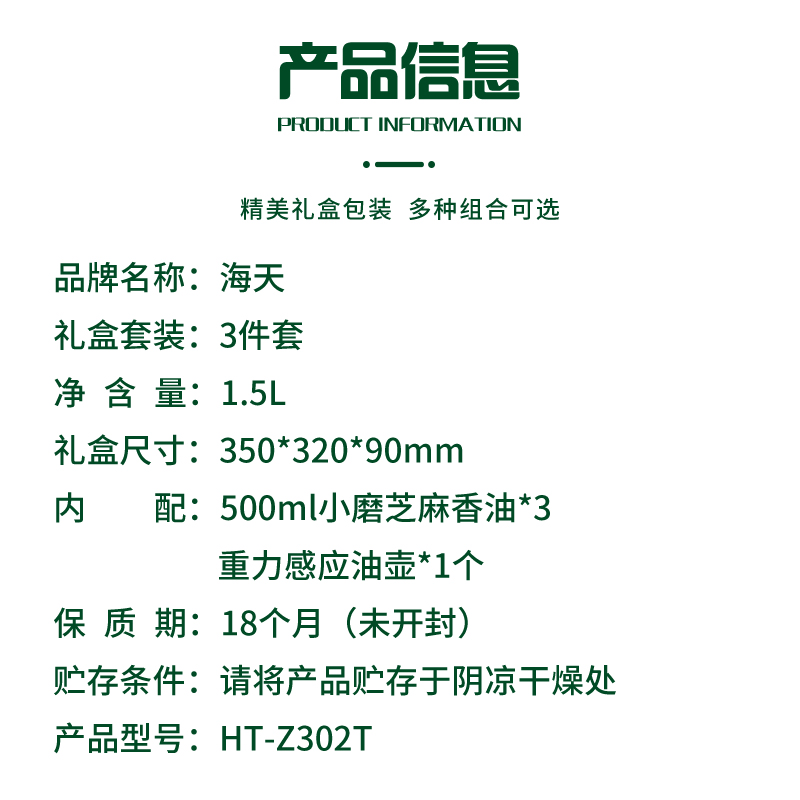 净含量:1.5L 内配:小磨芝麻香油(500mL铁罐*3) 重力感应油壶*1个 礼盒尺寸:331*296mm 推荐理由:员工福利、积分兑换、项目招标 优选醇正芝麻原料 100 %纯芝麻 独特水代法工艺 匠心古法 持久醇香 味美香浓 油而不腻 凉拌 制馅 蘸料 味碟