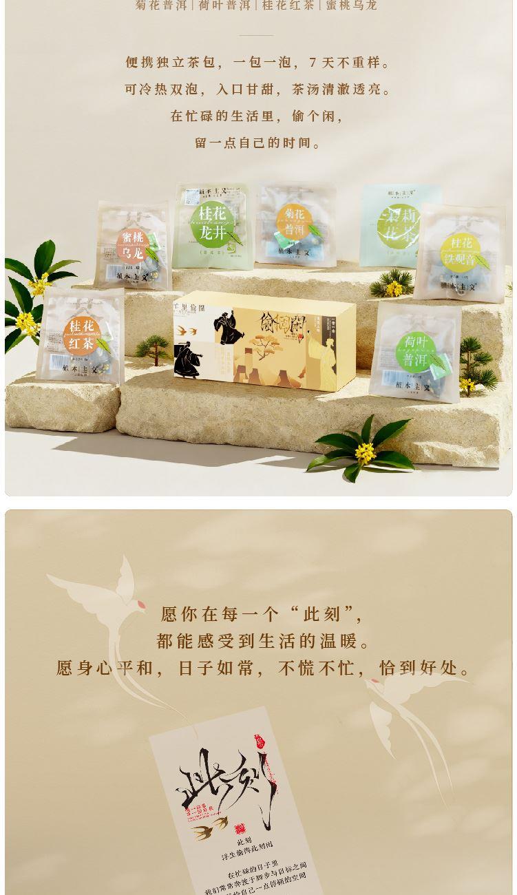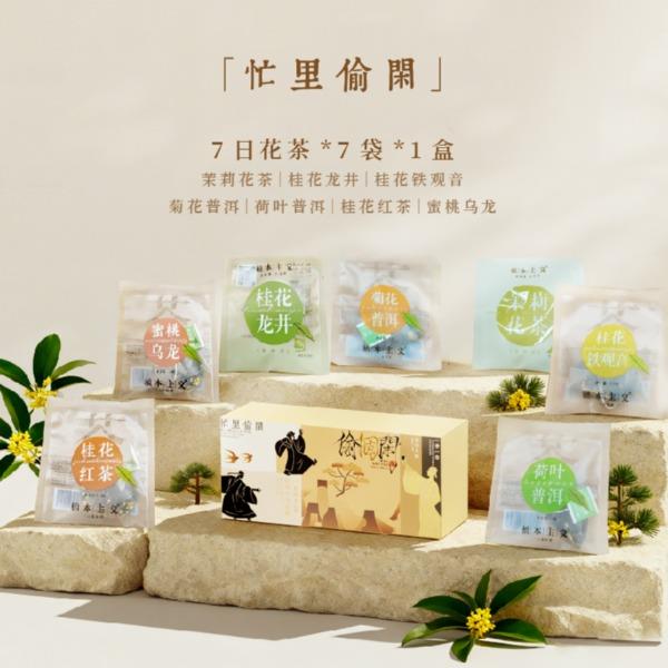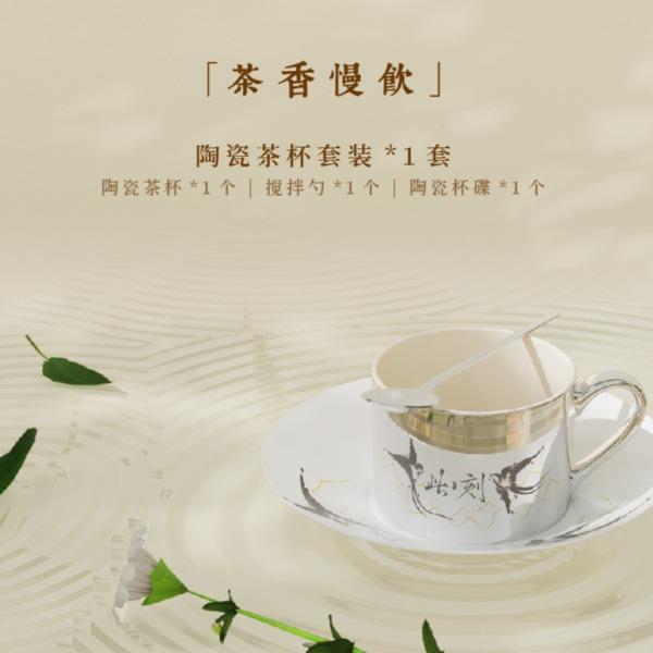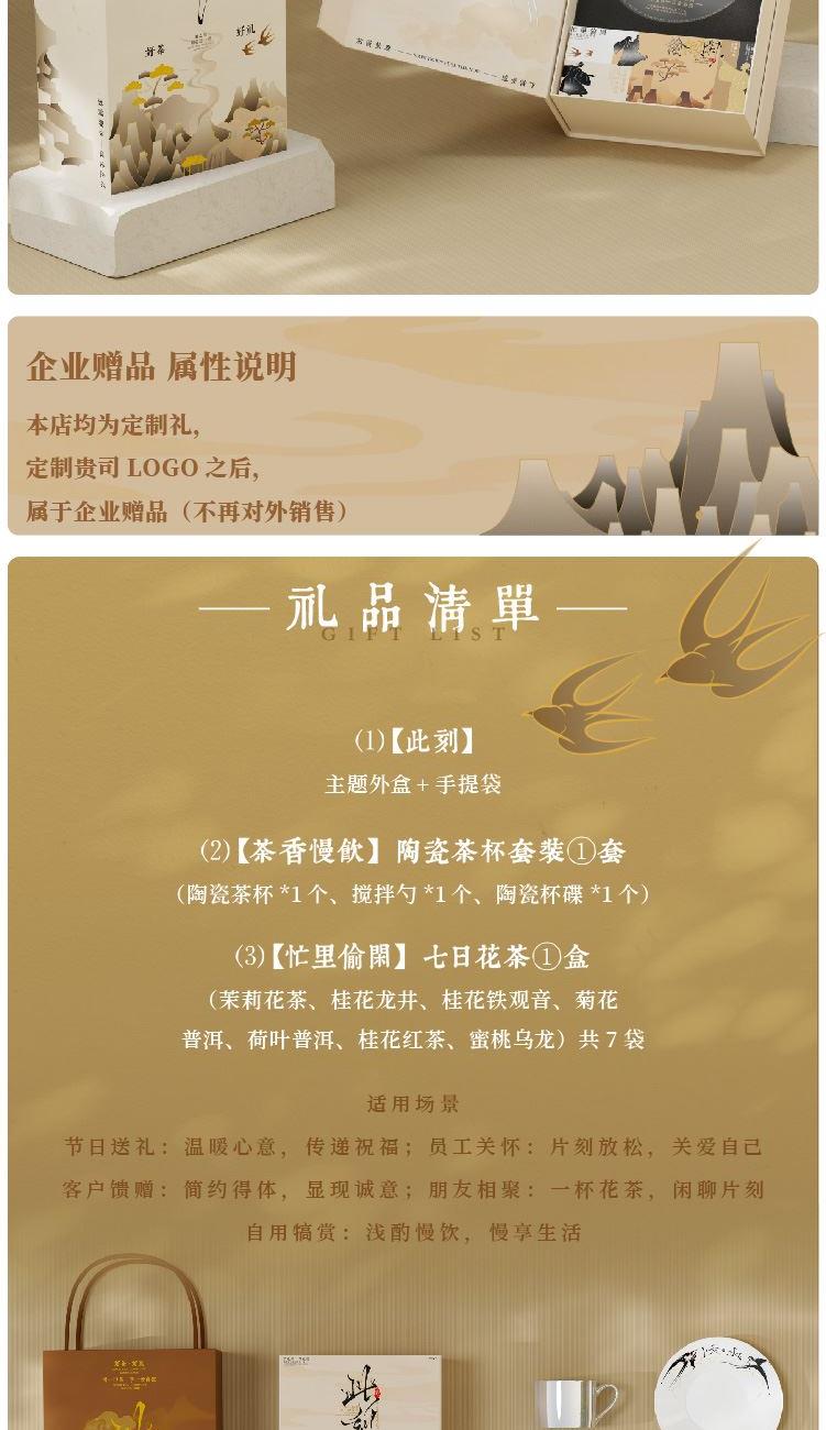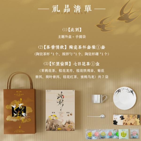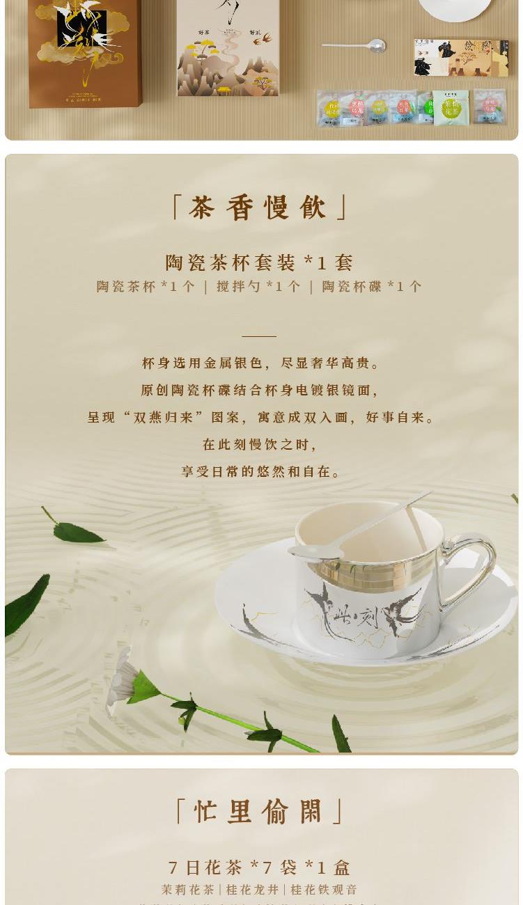 【此刻主题外盒】 1、[茶香慢饮]陶瓷茶杯套装(杯+勺+碟)*1套 2、[忙里偷闲]7日花茶*7袋*1盒